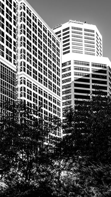Download 360x640 trees, buildings, windows, city, bw wallpaper, background nokia n8, c5, c6, c7, e7, x6 nokia 5800, 5230, 5228, sony ericsson vivaz