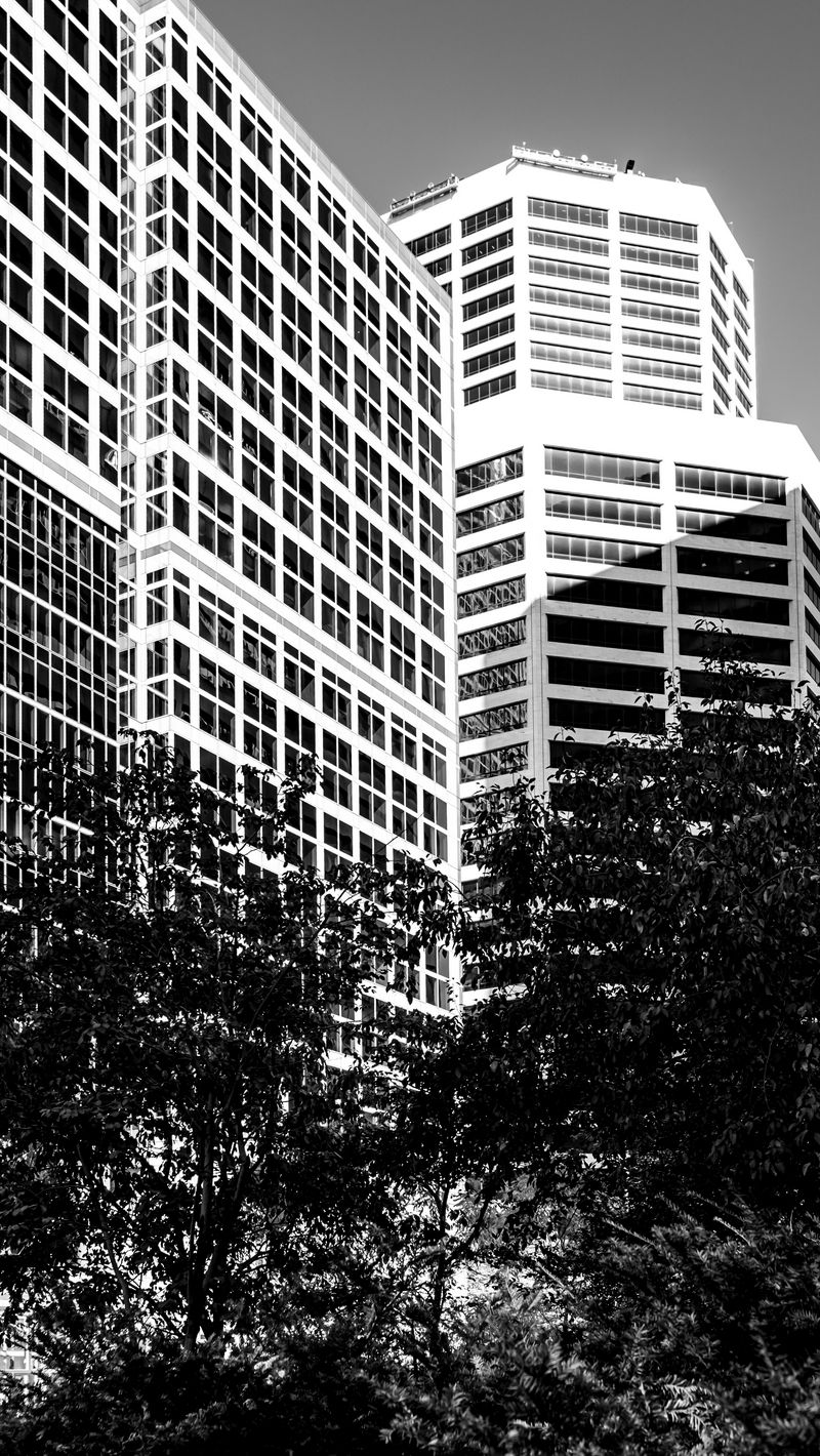 Download 800x1420 trees, buildings, windows, city, bw wallpaper, background iphone se/5s/5c/5 for parallax