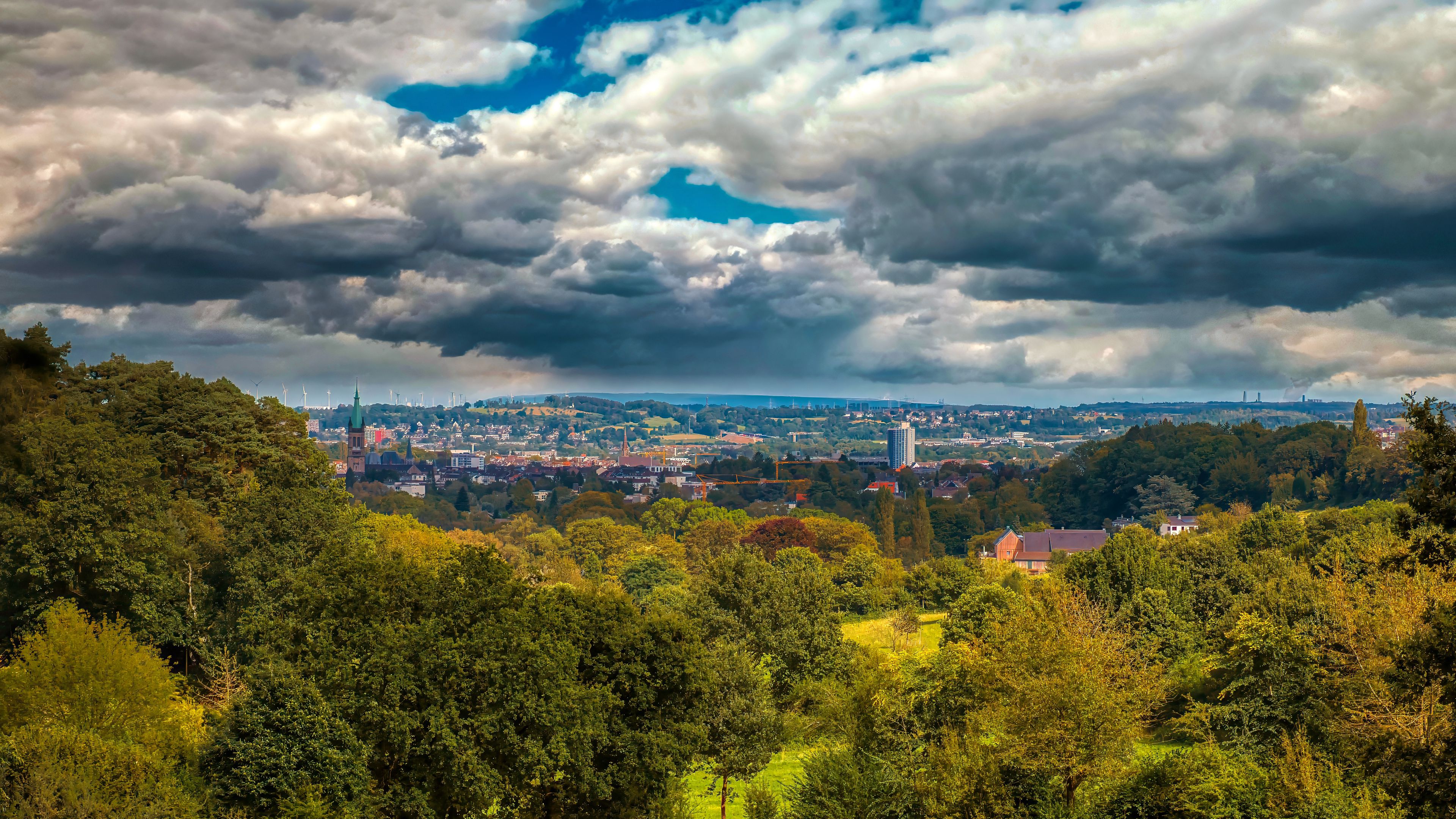 Download 3840x2160 trees, clouds, sky, city, tower wallpaper, background 4k uhd 16:9