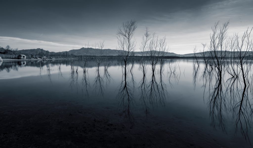Download 1024x600 trees, reflection, pond, dark wallpaper, background netbook, tablet