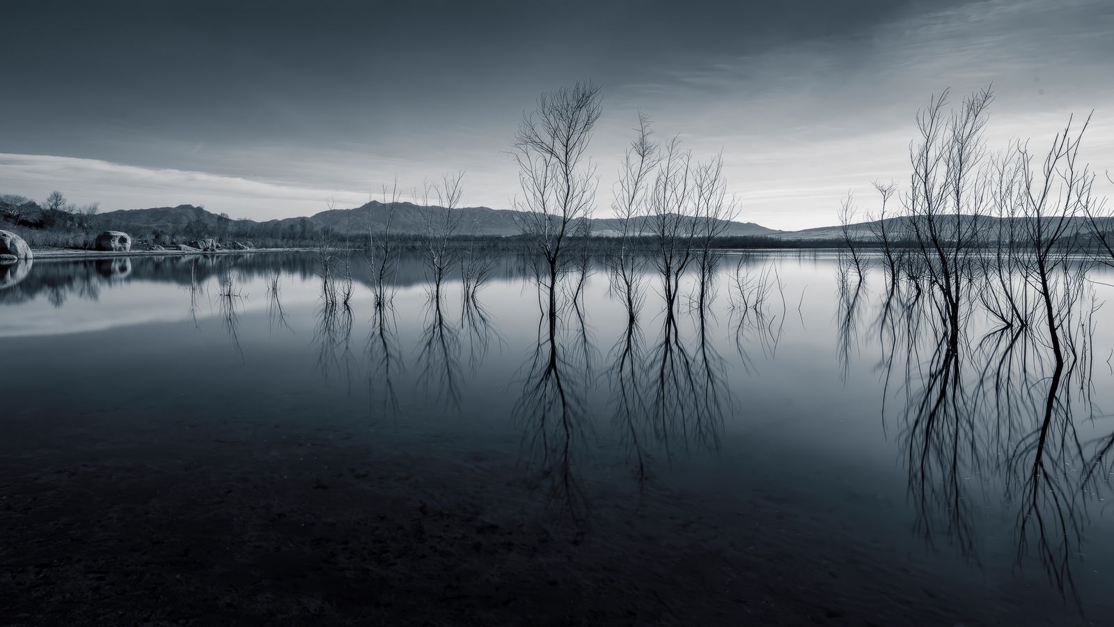 Download 1600x900 trees, reflection, pond, dark wallpaper, background widescreen 16:9