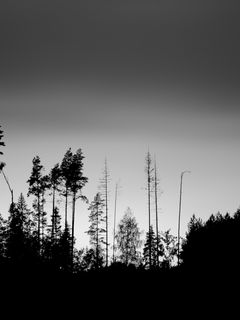 Download 240x320 trees, silhouettes, fog, sky, dark, bw wallpaper, background old mobile, cell phone, smartphone