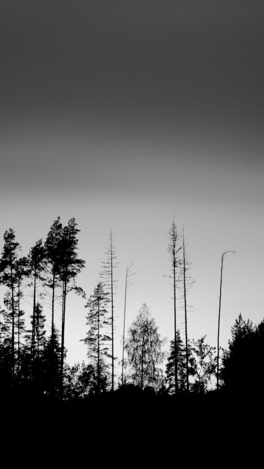 Download 540x960 trees, silhouettes, fog, sky, dark, bw wallpaper, background samsung galaxy s4 mini, microsoft lumia 535, philips xenium, lg l90, htc sensation