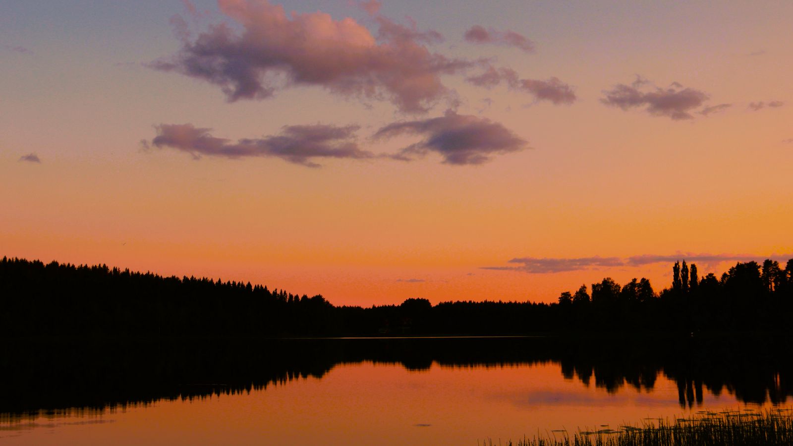 Download 1600x900 trees, silhouettes, forest, lake, clouds, sky, sunset, landscape wallpaper, background widescreen 16:9
