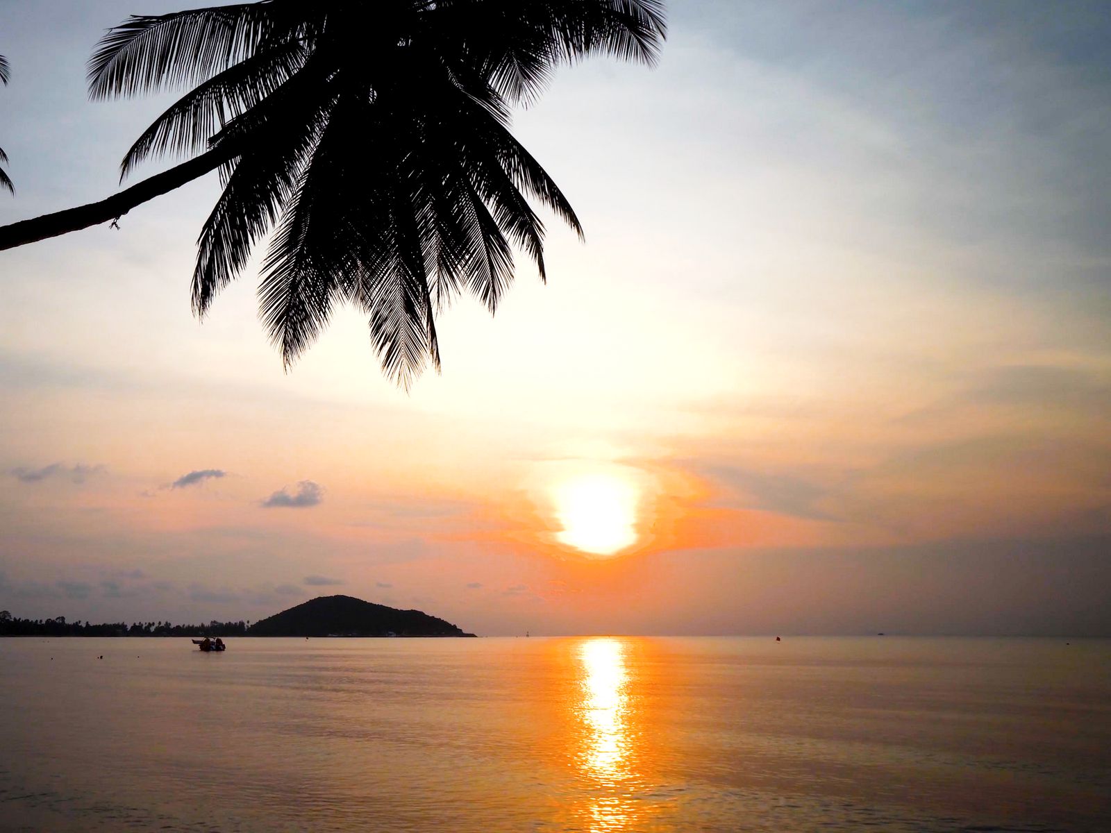 Download 1600x1200 tropics, sunset, reflection, sea, palm trees, nature wallpaper, background standard 4:3