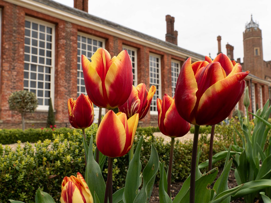 Download 1152x864 tulips, flowers, buds, flowerbed, building wallpaper, background standard 4:3