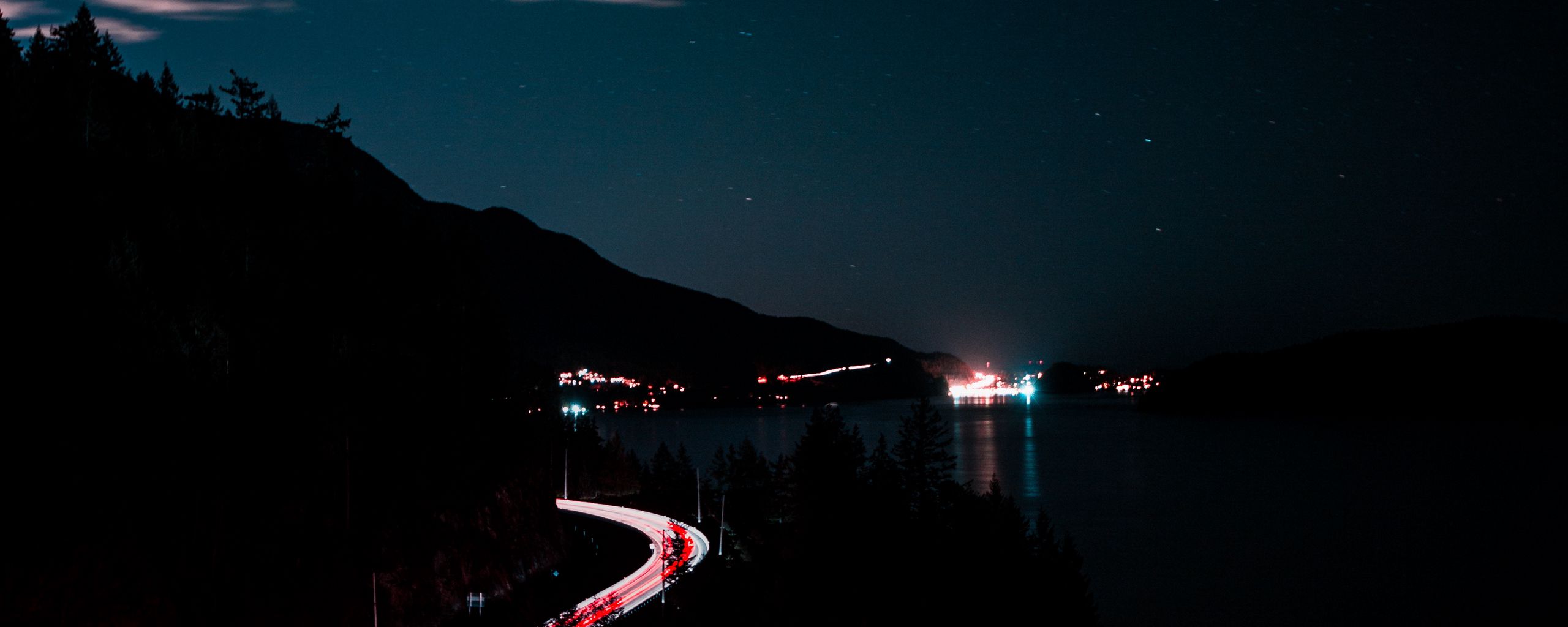 Download 2560x1024 turn, night, mountains, sky, road wallpaper, background ultrawide monitor