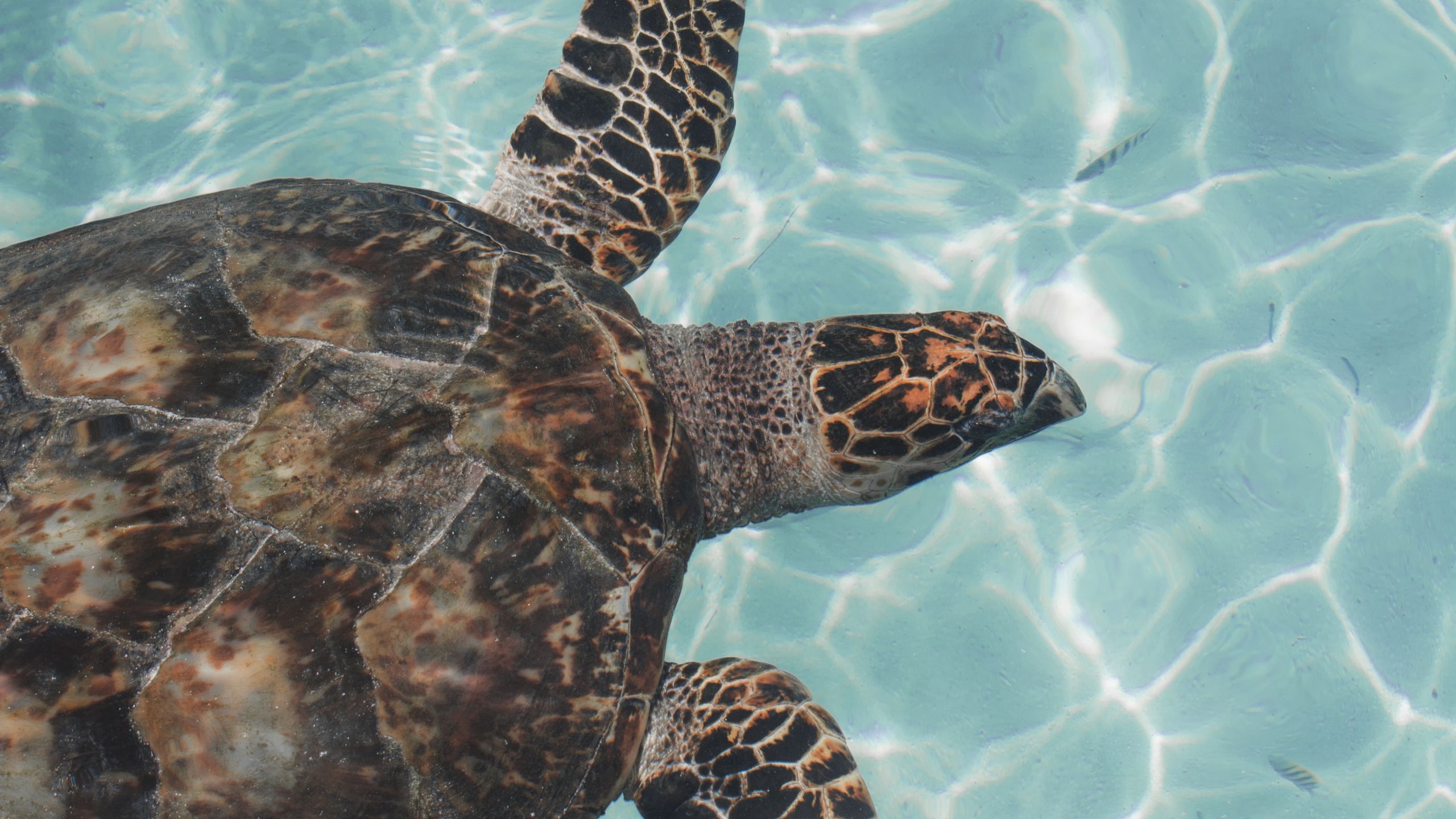 Download 2560x1440 turtle, water, waves, fish, swim wallpaper, background widescreen 16:9