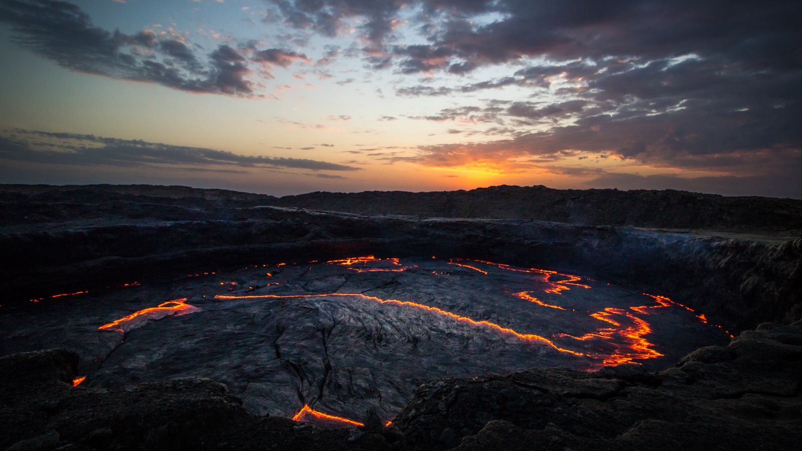 Download 1600x900 volcano, crater, lava, dusk, dark wallpaper, background widescreen 16:9