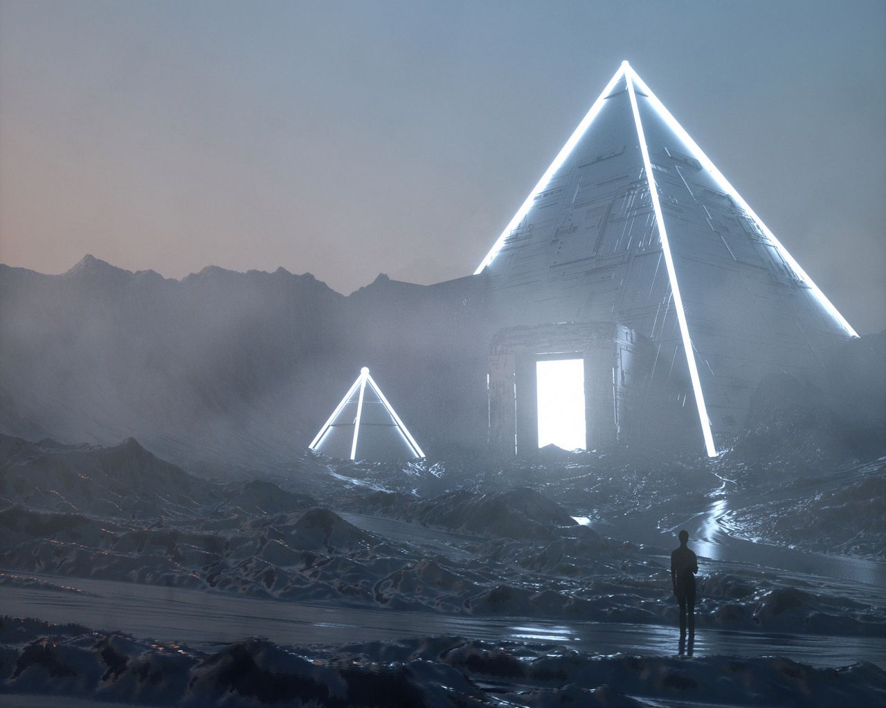Download 1280x1024 wanderer, silhouette, pyramids, neon, fantasy wallpaper, background standard 5:4