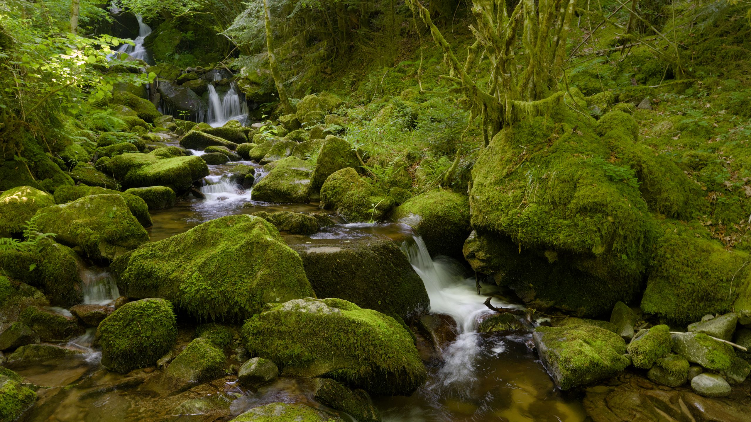 Download 2560x1440 water, river, waterfall, stones, moss, greenery, nature wallpaper, background widescreen 16:9